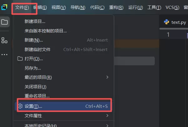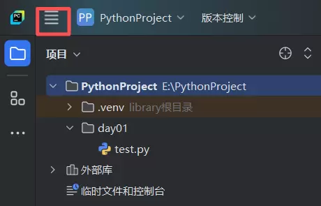 启动PyCharm后,点击左上角的菜单按钮(四条横线图标):