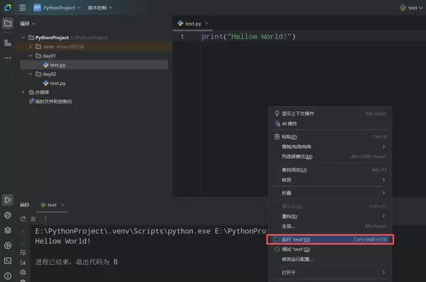 编写完代码后,可通过右键菜单选择“运行”,或者使用快捷键 Ctrl+Shift+F10 快速执行当前脚本。