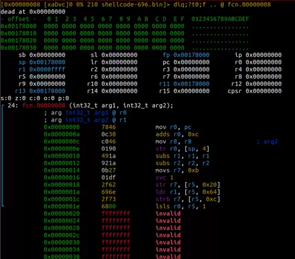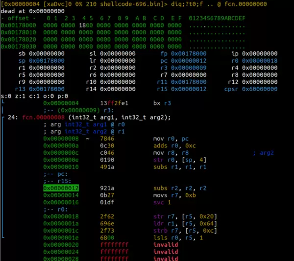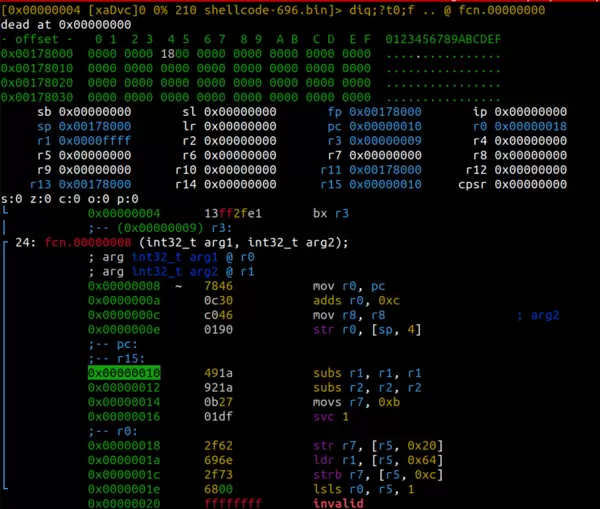 注意:我们可以选择移除前两条 ARM 指令,改用全 THUMB 编写的 shellcode。此时,在打开文件时设置 e asm.bits=16 即可全局启用 16 位模式,无需再单独定义函数。当然,保留两种模式混合的情况有助于展示更复杂的控制流程。