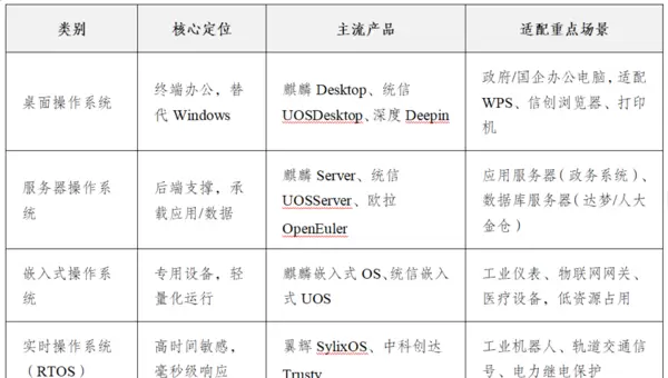 操作系统适配的本质是对应用系统进行技术调优,以支持其在信创体系下的正常运行。当前信创操作系统按应用场景划分为桌面、服务器、嵌入式、实时操作系统(RTOS)四大类。其中,前两类主要用于政务办公与企业信息系统,后两类则服务于工业控制、医疗设备等对响应时效要求较高的专用领域,共同构建起完整的信创应用生态。