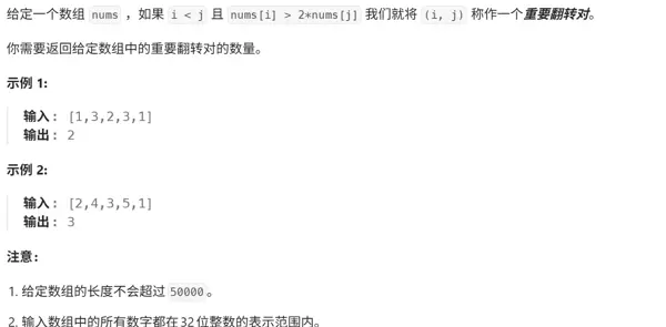 “翻转对”是逆序对的一种变体问题,通常定义为满足 i < j 且 nums[i] > 2 * nums[j] 的元素对。虽然条件更为严格,但仍可通过修改归并排序的比较逻辑来高效求解——在合并前先扫描一遍左半部分,统计满足条件的特殊逆序关系,再进行正常归并。