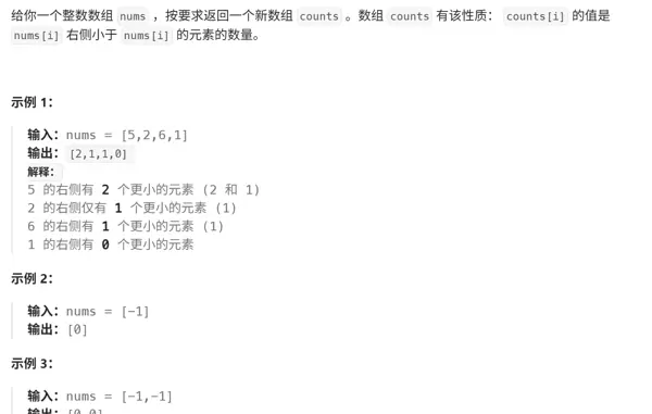 可以沿用翻转对的解题思路。由于条件 i < j 且 nums[i] > 2*nums[j] 的存在,无法在归并排序的合并过程中同时完成统计与合并操作,因此需要先进行翻转对的统计,再执行归并操作。 需要注意的是,在比较时应避免整数溢出问题,建议使用除法或类型转换来处理数值比较。 示例代码如下: class Solution { int tmp[50001]; public: int reversePairs(vector<int>& nums) { return mergeSort(nums, 0, nums.size() - 1); } int mergeSort(vector<int>& nums, int left, int right) { if (left >= right) return 0; int ret = 0; // 用于记录翻转对的数量 int mid = (left + right) >> 1; ret += mergeSort(nums, left, mid); ret += mergeSort(nums, mid + 1, right); int cur1 = left, cur2 = mid + 1, i = left; // 统计阶段:查找满足 nums[i] > 2 * nums[j] 的数量 while (cur1 <= mid && cur2 <= right) { if (nums[cur1] / 2.0 > nums[cur2]) { ret += mid - cur1 + 1; ++cur2; } else { ++cur1; } } // 归并阶段:将两个有序子数组合并 cur1 = left; cur2 = mid + 1; i = left; while (cur1 <= mid && cur2 <= right) { if (nums[cur1] <= nums[cur2]) tmp[i++] = nums[cur1++]; else tmp[i++] = nums[cur2++]; } while (cur1 <= mid) tmp[i++] = nums[cur1++]; while (cur2 <= right) tmp[i++] = nums[cur2++]; for (int j = left; j <= right; ++j) nums[j] = tmp[j]; return ret; } }; 题目:计算右侧小于当前元素的个数