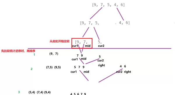 // 出现逆序:左半部分从cur1到mid的所有元素都与nums[cur2]构成逆序对