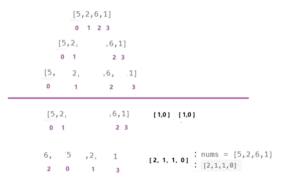 class Solution { vector<int> ret; // 存储最终结果 vector<int> index; // 记录各元素原始下标 int numstmp[100001]; // 临时数组,存放排序后的数值 int indextmp[100001]; // 临时数组,存放对应的下标 public: vector<int> countSmaller(vector<int>& nums) { int n = nums.size(); ret.resize(n); index.resize(n); for (int i = 0; i < n; ++i) { index[i] = i; } mergerSort(nums, 0, n - 1); return ret; } void mergerSort(vector<int>& nums, int left, int right) { if (left >= right) return; int mid = left + (right - left) / 2; mergerSort(nums, left, mid); mergerSort(nums, mid + 1, right); int cur1 = left, cur2 = mid + 1, i = left; while (cur1 <= mid && cur2 <= right) { if (nums[cur1] <= nums[cur2]) { numstmp[i] = nums[cur2]; indextmp[i++] = index[cur2++]; } else { ret[index[cur1]] += right - cur2 + 1; numstmp[i] = nums[cur1]; indextmp[i++] = index[cur1++]; } } while (cur1 <= mid) { numstmp[i] = nums[cur1]; indextmp[i++] = index[cur1++]; } while (cur2 <= right) { numstmp[i] = nums[cur2]; indextmp[i++] = index[cur2++]; } for (int j = left; j <= right; ++j) { nums[j] = numstmp[j]; index[j] = indextmp[j]; } } };