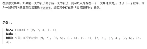 该问题要求计算数组中所有逆序对的总数。通过改造归并排序的合并逻辑,在合并两个有序子数组的过程中同步统计跨区间的逆序对数量,即可高效求解。