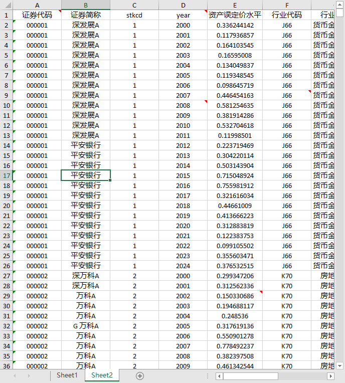 证券代码 证券简称 stkcd year 资产误定价水平 行业代码 行业名称 所属省份 所属省份代码 所属城市 所属城市代码