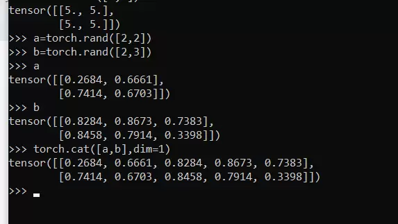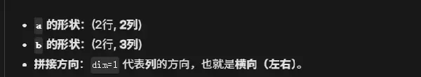 示例:设有两个矩阵 a(2×2)与 b(2×3),在列方向(dim=1)上进行拼接: