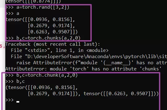 torch.chunk():用于将张量沿指定维度分割为若干等份块(chunks),常用于分批处理数据。