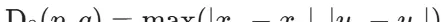 棋盘距离:允许水平、垂直及对角移动,对应8-邻接模式。代表从点 p 到 q 所需的最少移动次数(每步可走一格,包括斜向)。