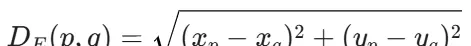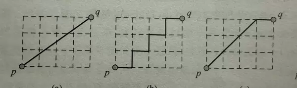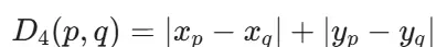 城区距离:仅允许沿水平或垂直方向移动,对应于4-邻接结构。其值等于从点 p 到 q 所需的最小步数(单位步长)。