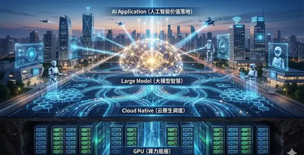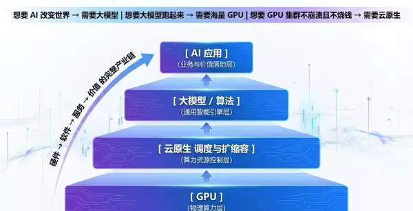 GPU 提供算力 → 云原生调度算力 → 大模型实现智能 → 人工智能走向真实世界价值落地