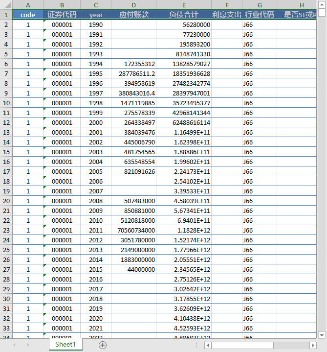 code 证券代码 year 应付账款 负债合计 利息支出 行业代码 是否ST或PT 上市日期 退市年份