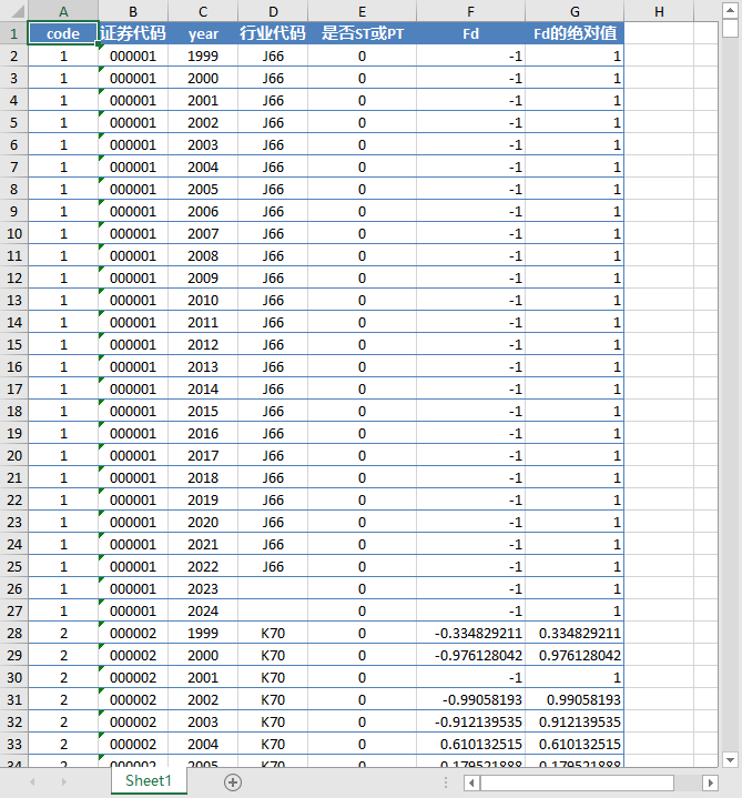 code 证券代码 year 行业代码 是否ST或PT Fd Fd的绝对值