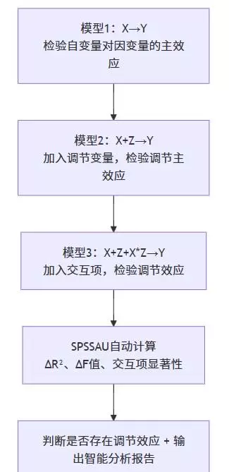 SPSSAU 平台采用标准的多层回归模型逻辑进行调节效应分析,系统自动完成三步建模过程(模型1 → 模型2 → 模型3),逐步检验变量加入后的模型变化情况。
