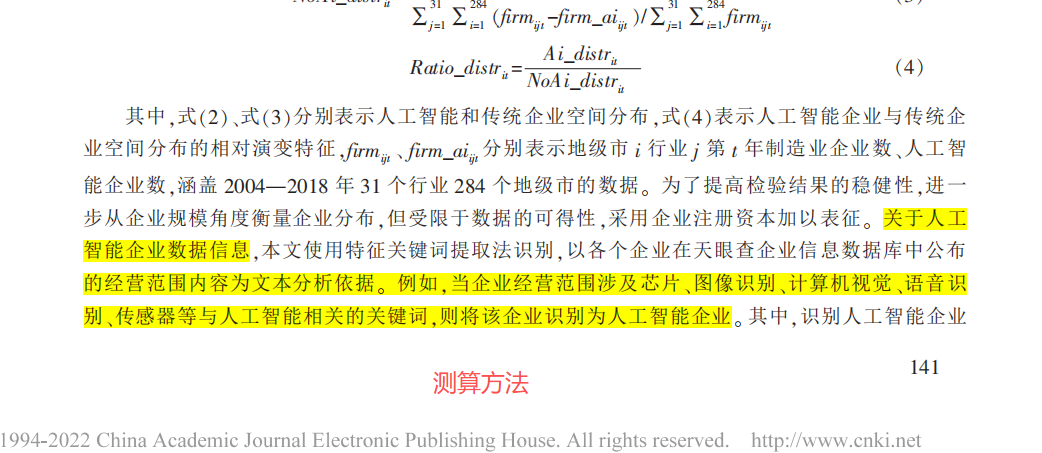参考《中国工业经济》中王林辉等(2022)的做法,当企业经营范围涉及芯片、图像识别、计算机视觉、语音识别、传感器等与人工智能相关的73个关键词时,将该企业识别为人工智能企业