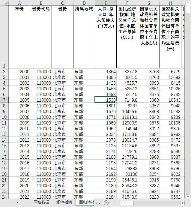 excel数据文件包原始数据(由于多年度指标不同存在缺失值)、线性插值、回归填补三个版本,提供您参考使用。