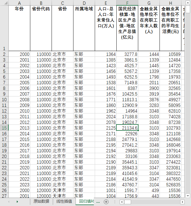 excel数据文件包原始数据(由于多年度指标不同存在缺失值)、线性插值、回归填补三个版本,提供您参考使用。