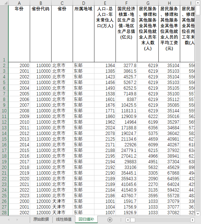 excel数据文件包原始数据(由于多年度指标不同存在缺失值)、线性插值、回归填补三个版本,提供您参考使用。