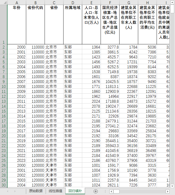 excel数据文件包原始数据(由于多年度指标不同存在缺失值)、线性插值、回归填补三个版本,提供您参考使用。