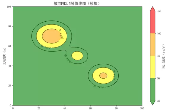 本图模拟一座 100 km × 100 km 范围的城市空气污染状况,通过颜色与等值线结合的方式构建“烟雾地形”。外围为绿色带,对应浓度 35 ?g/m?,代表空气质量良好区域;向内颜色逐步转暖,依次出现黄、橙、红、紫色区块,分别对应 50、75、100、150 ?g/m? 的污染等级。