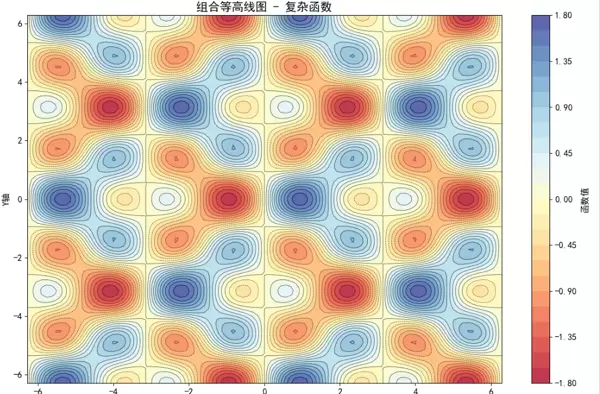 plt.title('组合等高线图 - 复杂函数', fontsize=16, fontweight='bold')