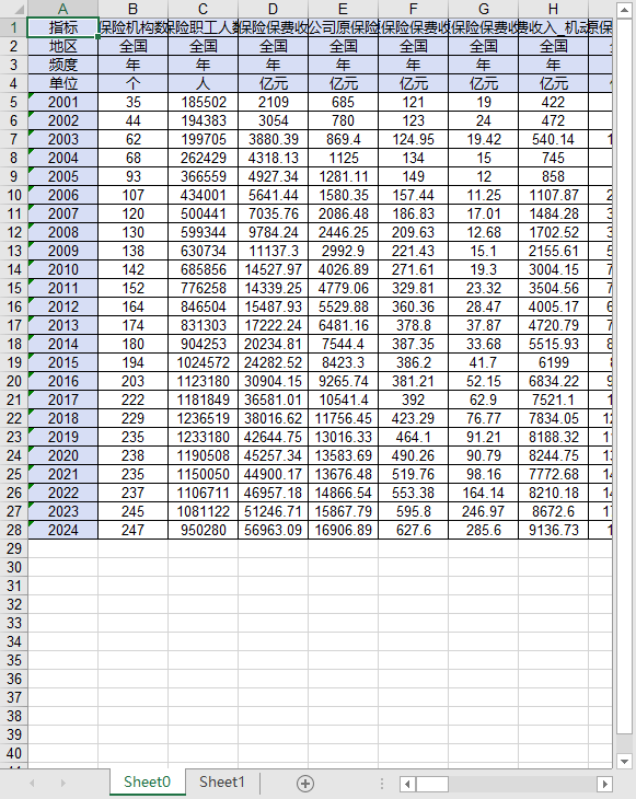 全国保险公司、保险系统机构数职工人数保费赔款给付2001-2024保费收入家庭企业财产险工程责任信用农业人身意外伤害保险寿险健康险