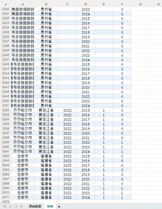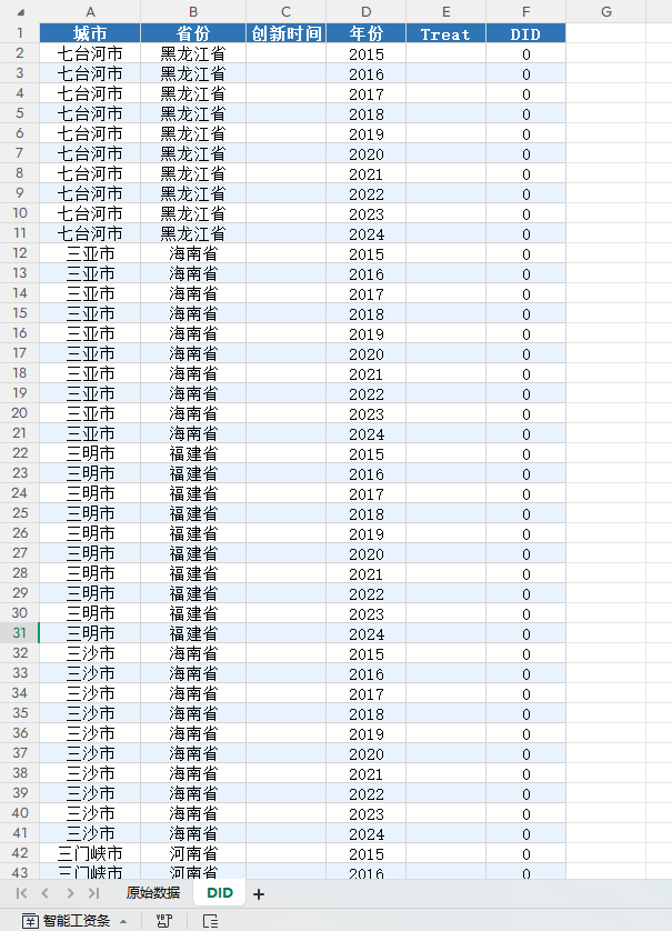 包含指标:城市、省份、创新时间、年份、Treat、DID
