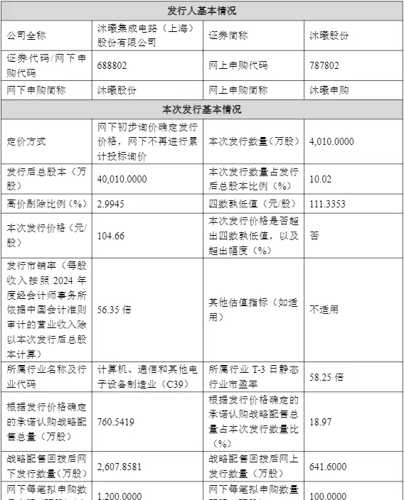 12月3日晚间,沐曦股份发布公告披露,公司本次新股发行价格确定为104.66元/股。根据公告内容,发行人与保荐机构(主承销商)基于网下询价结果协商后最终敲定该发行价。按此价格计算,上市时公司市值约为418.74亿元,对应2024年摊薄后静态市销率为56.35倍,低于同行业可比公司在同年份的平均市销水平。