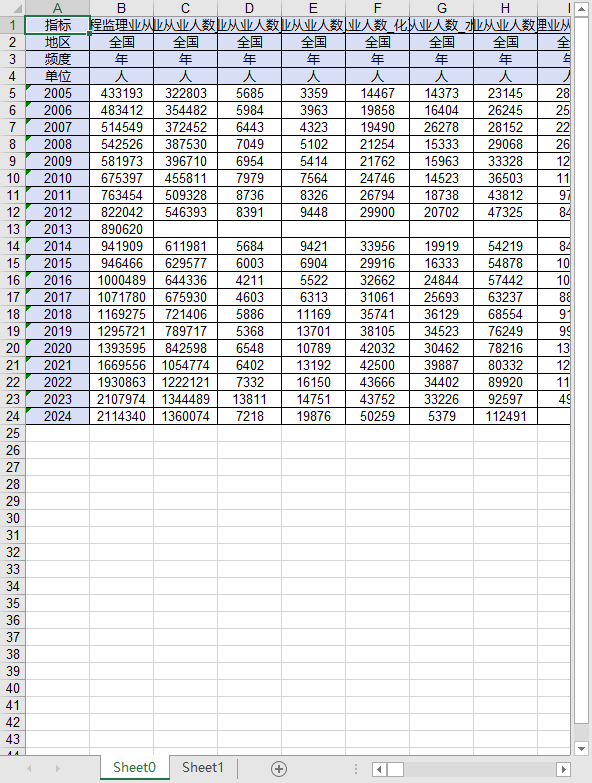 指标 建设工程监理业从业人数 建设工程监理业从业人数_房屋建筑工程 建设工程监理业从业人数_冶炼建筑工程 建设工程监理业从业人数_矿山建筑工程 建设工程监理业从业人数_化工、石油建筑工程 建设工程监理业从业人数_水利水电建筑工程 建设工程监理业从业人数_电力建筑工程 建设工程监理业从业人数_农林工程 建设工程监理业从业人数_铁路建筑工程 建设工程监理业从业人数_公路建筑工程 建设工程监理业从业人数_港口与航道建筑工程 建设工程监理业从业人数_航天航空建筑工程 建设工程监理业从业人数_通信建筑工程 建设工程监理业从业人数_市政公用建筑工程 建设工程监理业从业人数_机电安装建筑工程 建设工程监理业从业人数_综合资质 建设工程监理业从业人数_事务所资质 建设工程监理业从业人数_高、中级职称人员 建设工程监理业从业人数_房屋建筑工程_高、中级职称人员 建设工程监理业从业人数_冶炼建筑工程_高、中级职称人员 建设工程监理业从业人数_矿山建筑工程_高、中级职称人员 建设工程监理业从业人数_化工、石油建筑工程_高、中级职称人员 建设工程监理业从业人数_水利水电建筑工程_高、中级职称人员 建设工程监理业从业人数_电力建筑工程_高、中级职称人员 建设工程监理业从业人数_农林工程_高、中级职称人员 建设工程监理业从业人数_铁路建筑工程_高、中级职称人员 建设工程监理业从业人数_公路建筑工程_高、中级职称人员 建设工程监理业从业人数_港口与航道建筑工程_高、中级职称人员 建设工程监理业从业人数_航天航空建筑工程_高、中级职称人员 建设工程监理业从业人数_通信建筑工程_高、中级职称人员 建设工程监理业从业人数_市政公用建筑工程_高、中级职称人员 建设工程监理业从业人数_机电安装建筑工程_高、中级职称人员 建设工程监理业从业人数_综合资质_高、中级职称人员 建设工程监理业从业人数_事务所资质_高、中级职称人员 建设工程监理企业注册执业人数 建设工程监理企业注册执业人数_房屋建筑工程 建设工程监理企业注册执业人数_冶炼建筑工程 建设工程监理企业注册执业人数_矿山建筑工程 建设工程监理企业注册执业人数_化工、石油建筑工程 建设工程监理企业注册执业人数_水利水电建筑工程 建设工程监理企业注册执业人数_电力建筑工程 建设工程监理企业注册执业人数_农林工程 建设工程监理企业注册执业人数_铁路建筑工程 建设工程监理企业注册执业人数_公路建筑工程 建设工程监理企业注册执业人数_港口与航道建筑工程 建设工程监理企业注册执业人数_航天航空建筑工程 建设工程监理企业注册执业人数_通信建筑工程 建设工程监理企业注册执业人数_市政公用建筑工程 建设工程监理企业注册执业人数_机电安装建筑工程 建设工程监理企业注册执业人数_综合资质 建设工程监理企业注册执业人数_事务所资质 建设工程监理企业注册监理工程师执业人数 建设工程监理企业注册监理工程师执业人数_房屋建筑工程 建设工程监理企业注册监理工程师执业人数_冶炼建筑工程 建设工程监理企业注册监理工程师执业人数_矿山建筑工程 建设工程监理企业注册监理工程师执业人数_化工、石油建筑工程 建设工程监理企业注册监理工程师执业人数_水利水电建筑工程 建设工程监理企业注册监理工程师执业人数_电力建筑工程 建设工程监理企业注册监理工程师执业人数_农林工程 建设工程监理企业注册监理工程师执业人数_铁路建筑工程 建设工程监理企业注册监理工程师执业人数_公路建筑工程 建设工程监理企业注册监理工程师执业人数_港口与航道建筑工程 建设工程监理企业注册监理工程师执业人数_航天航空建筑工程 建设工程监理企业注册监理工程师执业人数_通信建筑工程 建设工程监理企业注册监理工程师执业人数_市政公用建筑工程 建设工程监理企业注册监理工程师执业人数_机电安装建筑工程 建设工程监理企业注册监理工程师执业人数_综合资质 建设工程监理企业注册监理工程师执业人数_事务所资质 建设工程监理企业营业收入 建设工程监理企业营业收入_房屋建筑工程 建设工程监理企业营业收入_冶炼建筑工程 建设工程监理企业营业收入_矿山建筑工程 建设工程监理企业营业收入_化工、石油建筑工程 建设工程监理企业营业收入_水利水电建筑工程 建设工程监理企业营业收入_电力建筑工程 建设工程监理企业营业收入_农林工程 建设工程监理企业营业收入_铁路建筑工程 建设工程监理企业营业收入_公路建筑工程 建设工程监理企业营业收入_港口与航道建筑工程 建设工程监理企业营业收入_航天航空建筑工程 建设工程监理企业营业收入_通信建筑工程 建设工程监理企业营业收入_市政公用建筑工程 建设工程监理企业营业收入_机电安装建筑工程 建设工程监理企业营业收入_综合资质 建设工程监理企业营业收入_事务所资质