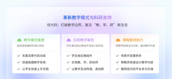 在教学模式革新方面,低代码平台正在重塑教与学的生态关系。其“可视化全栈开发”特性显著降低了学习门槛,兼顾教师教学、学生学习以及科研拓展的多重需求。