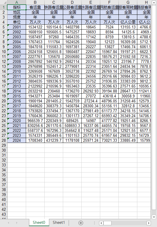 指标 客运量 铁路客运量 公路客运量 水路客运量 民航客运量 旅客周转量 铁路旅客周转量 公路旅客周转量 水路旅客周转量 民航旅客周转量 货运量 铁路货运量 公路货运量 水路货运量 海洋货运量 民航货运量 管道输送量 货物周转量 铁路货物周转量 公路货物周转量 水路货物周转量 海洋货物周转量 民航货物周转量 管道货物周转量 旅客运输平均运距 铁路旅客运输平均运距 公路旅客运输平均运距 水路旅客运输平均运距 民航旅客运输平均运距 货物运输平均运距 铁路货物运输平均运距 公路货物运输平均运距 水路货物运输平均运距 民航货物运输平均运距 管道货物运输平均运距