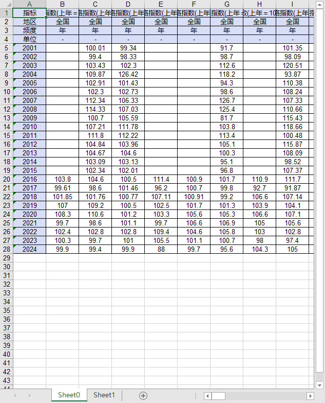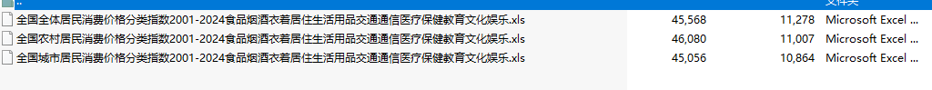 全国城市农村全体居民消费价格分类指数2001-2024食品烟酒衣着居住生活用品交通通信医疗保健教育文化娱乐
