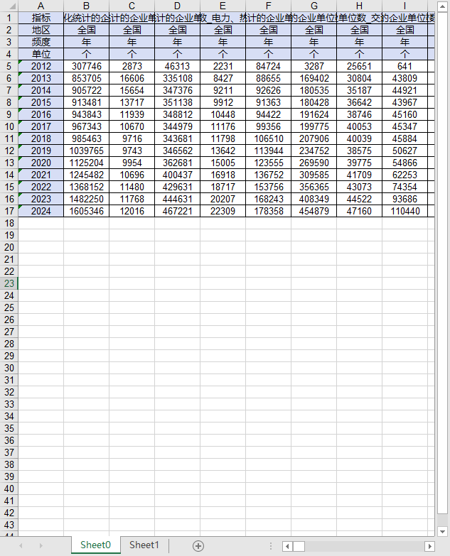 指标 纳入信息化统计的企业单位数 纳入信息化统计的企业单位数_采矿业 纳入信息化统计的企业单位数_制造业 纳入信息化统计的企业单位数_电力、热力、燃气及水生产和供应业 纳入信息化统计的企业单位数_建筑业 纳入信息化统计的企业单位数_批发和零售业 纳入信息化统计的企业单位数_交通运输、仓储和邮政业 纳入信息化统计的企业单位数_住宿和餐饮业 纳入信息化统计的企业单位数_信息传输、软件和信息技术服务业 纳入信息化统计的企业单位数_房地产业 纳入信息化统计的企业单位数_租赁和商务服务业 纳入信息化统计的企业单位数_科学研究和技术服务业 纳入信息化统计的企业单位数_水利、环境和公共设施管理业 纳入信息化统计的企业单位数_居民服务、修理和其他服务业 纳入信息化统计的企业单位数_教育 纳入信息化统计的企业单位数_卫生和社会工作 纳入信息化统计的企业单位数_文化、体育和娱乐业 纳入信息化统计的企业使用计算机台数 纳入信息化统计的企业使用计算机台数_采矿业 纳入信息化统计的企业使用计算机台数_制造业 纳入信息化统计的企业使用计算机台数_电力、热力、燃气及水生产和供应业 纳入信息化统计的企业使用计算机台数_建筑业 纳入信息化统计的企业使用计算机台数_批发和零售业 纳入信息化统计的企业使用计算机台数_交通运输、仓储和邮政业 纳入信息化统计的企业使用计算机台数_住宿和餐饮业 纳入信息化统计的企业使用计算机台数_信息传输、软件和信息技术服务业 纳入信息化统计的企业使用计算机台数_房地产业 纳入信息化统计的企业使用计算机台数_租赁和商务服务业 纳入信息化统计的企业使用计算机台数_科学研究和技术服务业 纳入信息化统计的企业使用计算机台数_水利、环境和公共设施管理业 纳入信息化统计的企业使用计算机台数_居民服务、修理和其他服务业 纳入信息化统计的企业使用计算机台数_教育 纳入信息化统计的企业使用计算机台数_卫生和社会工作 纳入信息化统计的企业使用计算机台数_文化、体育和娱乐业 纳入信息化统计的企业单位人口使用计算机数 纳入信息化统计的企业单位人口使用计算机数_采矿业 纳入信息化统计的企业单位人口使用计算机数_制造业 纳入信息化统计的企业单位人口使用计算机数_电力、热力、燃气及水生产和供应业 纳入信息化统计的企业单位人口使用计算机数_建筑业 纳入信息化统计的企业单位人口使用计算机数_批发和零售业 纳入信息化统计的企业单位人口使用计算机数_交通运输、仓储和邮政业 纳入信息化统计的企业单位人口使用计算机数_住宿和餐饮业 纳入信息化统计的企业单位人口使用计算机数_信息传输、软件和信息技术服务业 纳入信息化统计的企业单位人口使用计算机数_房地产业 纳入信息化统计的企业单位人口使用计算机数_租赁和商务服务业 纳入信息化统计的企业单位人口使用计算机数_科学研究和技术服务业 纳入信息化统计的企业单位人口使用计算机数_水利、环境和公共设施管理业 纳入信息化统计的企业单位人口使用计算机数_居民服务、修理和其他服务业 纳入信息化统计的企业单位人口使用计算机数_教育 纳入信息化统计的企业单位人口使用计算机数_卫生和社会工作 纳入信息化统计的企业单位人口使用计算机数_文化、体育和娱乐业 纳入信息化统计的企业拥有网站数 纳入信息化统计的企业拥有网站数_采矿业 纳入信息化统计的企业拥有网站数_制造业 纳入信息化统计的企业拥有网站数_电力、热力、燃气及水生产和供应业 纳入信息化统计的企业拥有网站数_建筑业 纳入信息化统计的企业拥有网站数_批发和零售业 纳入信息化统计的企业拥有网站数_交通运输、仓储和邮政业 纳入信息化统计的企业拥有网站数_住宿和餐饮业 纳入信息化统计的企业拥有网站数_信息传输、软件和信息技术服务业 纳入信息化统计的企业拥有网站数_房地产业 纳入信息化统计的企业拥有网站数_租赁和商务服务业 纳入信息化统计的企业拥有网站数_科学研究和技术服务业 纳入信息化统计的企业拥有网站数_水利、环境和公共设施管理业 纳入信息化统计的企业拥有网站数_居民服务、修理和其他服务业 纳入信息化统计的企业拥有网站数_教育 纳入信息化统计的企业拥有网站数_卫生和社会工作 纳入信息化统计的企业拥有网站数_文化、体育和娱乐业 单位纳入信息化统计的企业拥有网站数 单位纳入信息化统计的企业拥有网站数_采矿业 单位纳入信息化统计的企业拥有网站数_制造业 单位纳入信息化统计的企业拥有网站数_电力、热力、燃气及水生产和供应业 单位纳入信息化统计的企业拥有网站数_建筑业 单位纳入信息化统计的企业拥有网站数_批发和零售业 单位纳入信息化统计的企业拥有网站数_交通运输、仓储和邮政业 单位纳入信息化统计的企业拥有网站数_住宿和餐饮业 单位纳入信息化统计的企业拥有网站数_信息传输、软件和信息技术服务业 单位纳入信息化统计的企业拥有网站数_房地产业 单位纳入信息化统计的企业拥有网站数_租赁和商务服务业 单位纳入信息化统计的企业拥有网站数_科学研究和技术服务业 单位纳入信息化统计的企业拥有网站数_水利、环境和公共设施管理业 单位纳入信