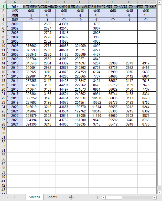 全国文化文物机构数公共图书馆数从业人员数相关产业资产营业收入税金附加营业利润应交增值税2001-2024群众文化服务业文化市场经营机构