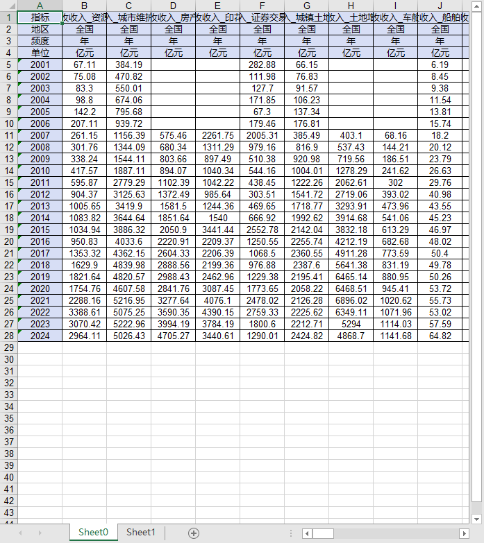 指标 税收收入_资源税 税收收入_城市维护建设税 税收收入_房产税 税收收入_印花税 税收收入_证券交易印花税 税收收入_城镇土地使用税 税收收入_土地增值税 税收收入_车船税 税收收入_船舶吨税 税收收入_车辆购置税 税收收入_耕地占用税 税收收入_契税 税收收入_烟叶税 税收收入_其他税收 非税收入 非税收入_专项收入 非税收入_行政事业性收费收入 非税收入_罚没收入 非税收入_其他收入 一般公共预算收入 税收收入 税收收入_国内增值税 税收收入_国内消费税 税收收入_关税 税收收入_个人所得税 税收收入_企业所得税 中央一般公共预算收入 中央税收收入 中央税收收入_国内增值税 中央税收收入_国内消费税 中央税收收入_企业所得税 中央税收收入_个人所得税 中央税收收入_城市维护建设税 中央税收收入_印花税 中央税收收入_证券交易印花税 中央税收收入_船舶吨税 中央税收收入_车辆购置税 中央税收收入_关税 中央税收收入_其他税收 中央非税收入 中央非税收入_专项收入 中央非税收入_行政事业性收费收入 中央非税收入_罚没收入 中央非税收入_其他收入 地方一般公共预算收入 地方税收收入 地方税收收入_国内增值税 地方税收收入_企业所得税 地方税收收入_个人所得税 地方税收收入_资源税 地方税收收入_城市维护建设税 地方税收收入_房产税 地方税收收入_印花税 地方税收收入_城镇土地使用税 地方税收收入_土地增值税 地方税收收入_车船税 地方税收收入_耕地占用税 地方税收收入_契税 地方税收收入_烟叶税 地方税收收入_其他税收 地方非税收入 地方非税收入_专项收入 地方非税收入_行政事业性收费收入 地方非税收入_罚没收入 地方非税收入_国有资本经营收入 地方非税收入_国有资源(资产)有偿使用收入 地方非税收入_其他收入
