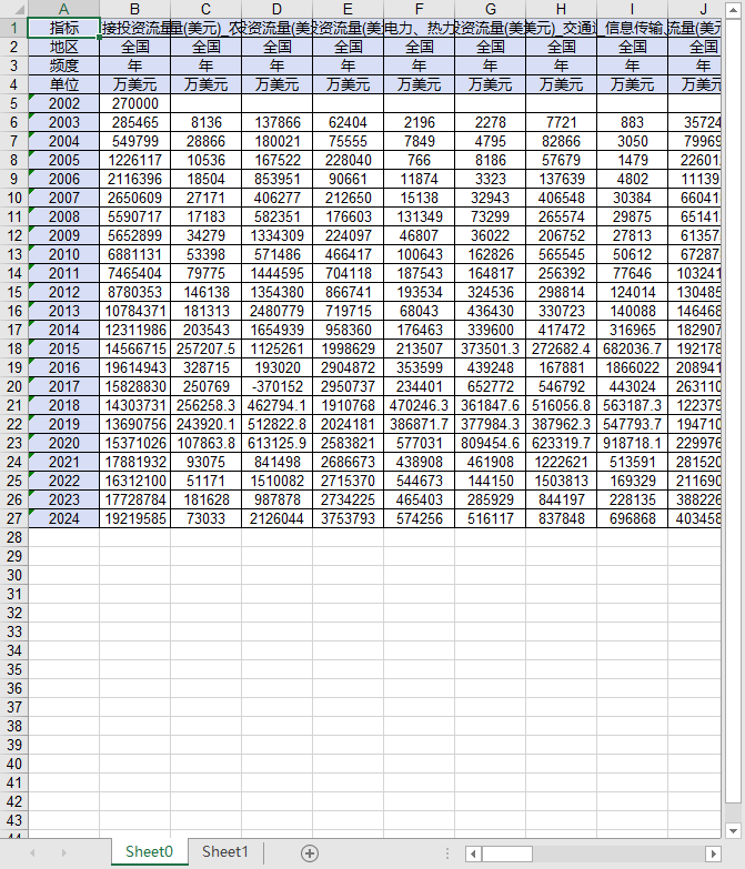 指标 对外直接投资流量(美元) 对外直接投资流量(美元)_农、林、牧、渔业 对外直接投资流量(美元)_采矿业 对外直接投资流量(美元)_制造业 对外直接投资流量(美元)_电力、热力、燃气及水生产和供应业 对外直接投资流量(美元)_建筑业 对外直接投资流量(美元)_交通运输、仓储和邮政业 对外直接投资流量(美元)_信息传输、软件和信息技术服务业 对外直接投资流量(美元)_批发和零售业 对外直接投资流量(美元)_住宿和餐饮业 对外金融类直接投资流量(美元) 对外直接投资流量(美元)_房地产业 对外直接投资流量(美元)_租赁和商务服务业 对外直接投资流量(美元)_科学研究和技术服务业 对外直接投资流量(美元)_水利、环境和公共设施管理业 对外直接投资流量(美元)_居民服务、修理和其他服务业 对外直接投资流量(美元)_教育 对外直接投资流量(美元)_卫生和社会工作 对外直接投资流量(美元)_文化、体育和娱乐业 对外直接投资存量(美元) 对外直接投资存量(美元)_农、林、牧、渔业 对外直接投资存量(美元)_采矿业 对外直接投资存量(美元)_制造业 对外直接投资存量(美元)_电力、热力、燃气及水生产和供应业 对外直接投资存量(美元)_建筑业 对外直接投资存量(美元)_交通运输、仓储和邮政业 对外直接投资存量(美元)_信息传输、软件和信息技术服务业 对外直接投资存量(美元)_批发和零售业 对外直接投资存量(美元)_住宿和餐饮业 对外直接投资存量(美元)_金融业 对外直接投资存量(美元)_房地产业 对外直接投资存量(美元)_租赁和商务服务业 对外直接投资存量(美元)_科学研究和技术服务业 对外直接投资存量(美元)_水利、环境和公共设施管理业 对外直接投资存量(美元)_居民服务、修理和其他服务业 对外直接投资存量(美元)_教育 对外直接投资存量(美元)_卫生和社会工作 对外直接投资存量(美元)_文化、体育和娱乐业