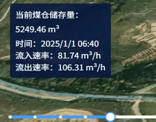 底部设有滑块控件与操作按钮,可手动模拟不同时间节点下的煤仓状态变化,动态刷新仓储量、进出料速率等关键参数。