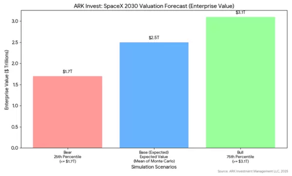 知名科技投资人凯茜·伍德(Cathie Wood)领导的方舟投资管理公司(ARK Investment)近期发布了一项重磅预测:到2030年,SpaceX的企业价值可能达到约2.5万亿美元。该预测基于蒙特卡洛模拟方法,通过随机抽样和统计分析对多种变量进行建模计算。