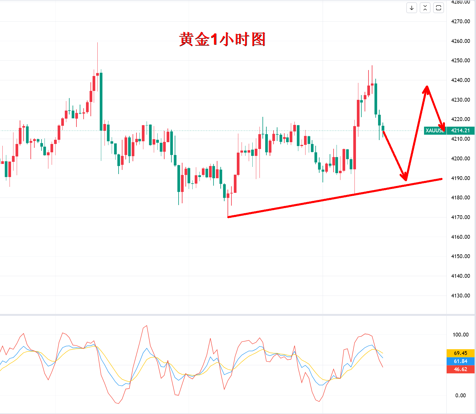 从1小时势来看,4220美元虽然突破后到了4250美元,不过前高点仍然没有突破,回踩后依托前低点为关键性支撑,4220美元不是顶底转换的位置,震荡行情卡底部作为支撑。之前,我几次提及影响黄金接下来牛市延续的根本在于新主席的确定以及他的货币政策态度,一定要有强烈的叙事事件才能引发市场共识,8-10月黄金上涨基于美联储重新启动降息,没有基本面情绪的推动,震荡就没有结束。今天,金价冲击4250美元之后回落,说明上方压力仍然很强,而下面支撑集中在4180-75美元附近,下午回落后首次触及4190-95美元多,防守在4170下方,向上首次碰到4230-35美元空,防守在4260美元上方,目标各看20-25美金即可。