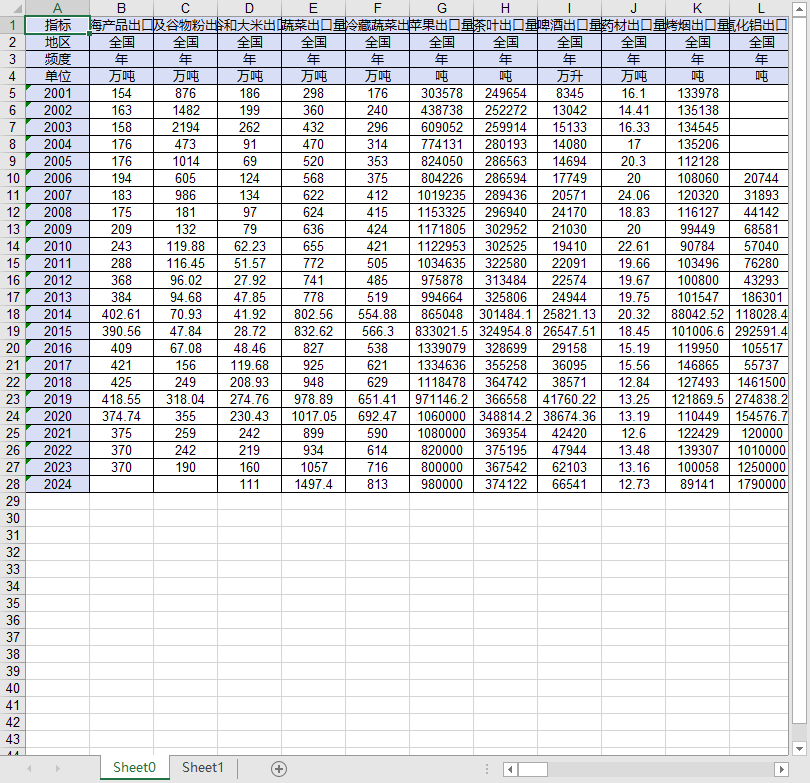 指标 水海产品出口量 谷物及谷物粉出口量 稻谷和大米出口量 蔬菜出口量 鲜或冷藏蔬菜出口量 苹果出口量 茶叶出口量 啤酒出口量 药材出口量 烤烟出口量 氧化铝出口量 煤及褐煤出口量 焦炭及半焦炭出口量 成品油出口量 合成有机染料出口量 医药材及药品出口量 中式成药出口量 医用敷料出口量 烟花、爆竹出口量 新的充气橡胶轮胎出口量(吨) 水泥及水泥熟料出口量 日用陶瓷制品出口量 钢材出口量 铝材出口量 钢铁或铜制标准紧固件出口量 手用或机用工具出口量 电风扇出口量 自动数据处理设备的零件出口量 轴承出口量(吨) 原电池出口量 蓄电池出口量 电视机出口量 二极管及类似半导体器件出口量 电线电缆出口量 集装箱出口量 汽车(含底盘)出口量 自行车出口量 船舶出口量 手表出口量 未锻造的铜及铜材出口量 水海产品出口额(美元) 谷物及谷物粉出口额(美元) 稻谷和大米出口额(美元) 蔬菜出口额(美元) 鲜或冷藏蔬菜出口额(美元) 苹果出口额(美元) 茶叶出口额(美元) 啤酒出口额(美元) 药材出口额(美元) 烤烟出口额(美元) 氧化铝出口额(美元) 煤及褐煤出口额(美元) 焦炭及半焦炭出口额(美元) 成品油出口额(美元) 合成有机染料出口额(美元) 医药材及药品出口额(美元) 中式成药出口额(美元) 医用敷料出口额(美元) 烟花、爆竹出口额(美元) 新的充气橡胶轮胎出口额(美元) 水泥及水泥熟料出口额(美元) 玻璃及玻璃制品出口额(美元) 日用陶瓷制品出口额(美元) 钢材出口额(美元) 铝材出口额(美元) 钢铁或铜制标准紧固件出口额(美元) 手用或机用工具出口额(美元) 电风扇出口额(美元) 纺织机械及零件出口额(美元) 自动数据处理设备及其零部件出口额(美元) 自动数据处理设备的零件出口额(美元) 轴承出口额(美元) 原电池出口额(美元) 蓄电池出口额(美元) 电视机出口额(美元) 二极管及类似半导体器件出口额(美元) 电线电缆出口额(美元) 集装箱出口额(美元) 汽车(含底盘)出口额(美元) 汽车零件出口额(美元) 自行车出口额(美元) 船舶出口额(美元) 医疗仪器及器械出口额(美元) 手表出口额(美元) 家具及其零件出口额(美元) 非针织钩编织物服装出口额(美元) 塑料制品出口额(美元) 玩具出口额(美元) 伞出口额(美元) 机电产品出口额(美元) 高新技术产品出口额(美元) 未锻造的铜及铜材出口额(美元)