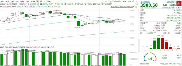 12月10日,A股市场整体呈现震荡整理态势。上证指数盘中一度失守3900点,但尾盘小幅回升,勉强收复该整数关口。深市表现相对较强,深证成指午后在权重板块带动下翻红,创业板指则基本维持窄幅波动。截至收盘,上证指数报3900.5点,微跌0.23%;深证成指收于13316.42点,上涨0.29%;创业板指报3209点,下跌0.02%。两市成交金额继续回落,市场交投趋于清淡。