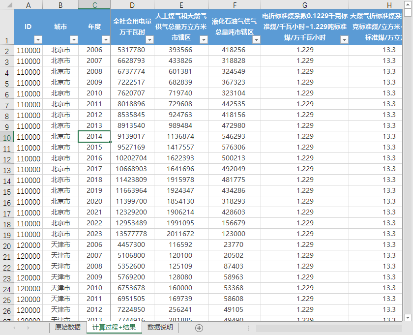 ID 城市 年度 全社会用电量万千瓦时 人工煤气和天然气供气总量万立方米市辖区 液化石油气供气总量吨市辖区 电折标准煤系数0.1229千克标准煤/千瓦小时=1.229吨标准煤/万千瓦小时 天然气折标准煤系数1.33千克标准煤/立方米=13.3吨标准煤/万立方米 液化石油气折标准煤系数1.7143千克标准煤/千克=1.7143吨标准煤/吨 总吨标准煤 能源消费总量(万吨标准煤) 地区生产总值(亿元) 能源消费强度(单位GDP能耗)(单位:万吨标准煤/亿元)