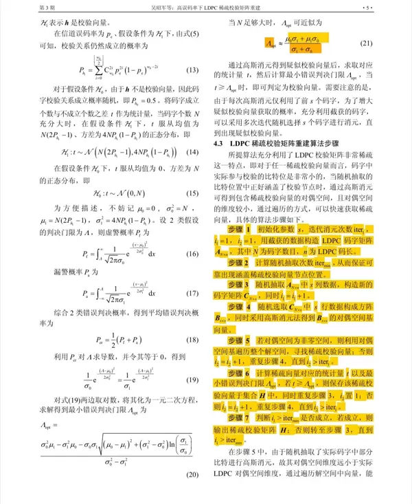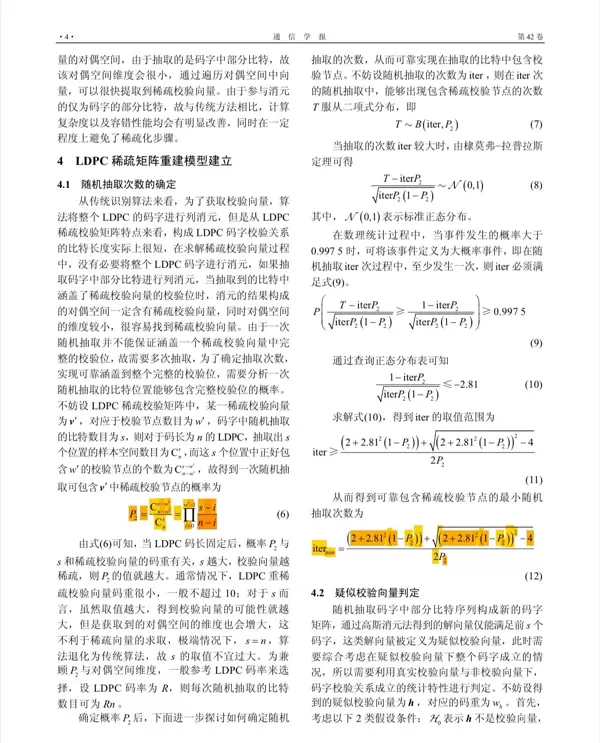 在缺乏先验参数的情况下,识别接收到的码字是否属于某类LDPC码,需借助统计与代数相结合的方法。一种有效的策略是利用高斯消元法分析码字间的线性相关性: