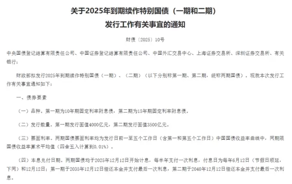 本次计划发行的特别国债分为两期:第一期为10年期,规模4000亿元;第二期为15年期,规模3500亿元。操作方式延续以往多次特别国债续作的惯例,属于原债务的等额滚动发行,所筹资金将专项用于偿还当月到期的本金,与原有资产负债相对应,不计入财政赤字。