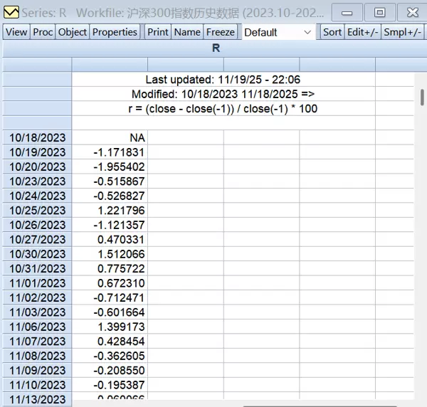 在EViews命令窗口中执行以下指令完成收益率序列生成:genr r = (close - close(-1)) / close(-1) * 100