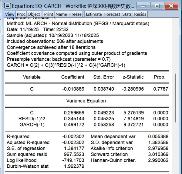 因此,该ARMA(1,1)模型成功提取了沪深300指数收益率的动态特征,为后续构建GARCH模型奠定了良好的均值方程基础。