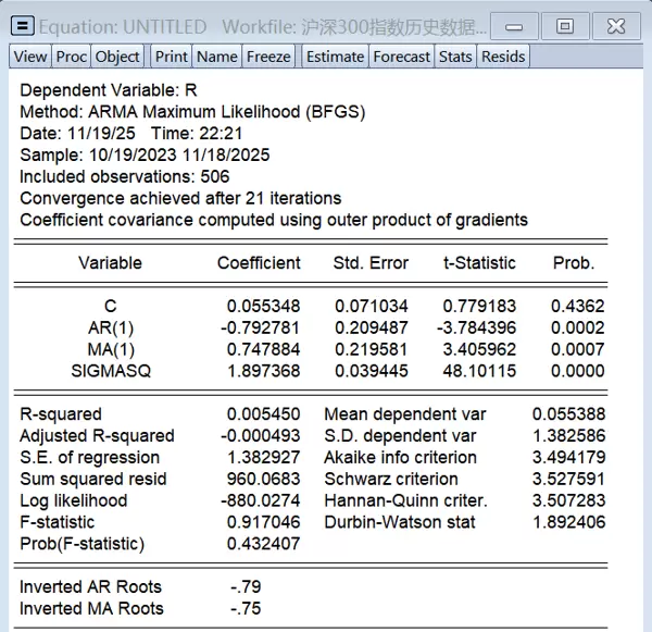 从回归结果可以看出,所有参数的t统计量均通过显著性检验,表明模型设定合理。此外,倒置AR根为-0.79,倒置MA根为-0.75,均位于单位圆内,满足平稳性与可逆性条件,进一步验证了模型设定的恰当性。