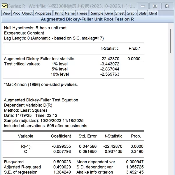 结果显示,常数项z = -0.281(p = 0.779),不显著,表明沪深300指数收益率序列没有明显的均值回复或趋势成分,符合有效市场假说的基本预期。