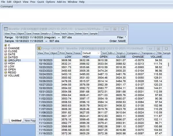 经初步检查,日度交易数据在时间跨度上连续完整,无缺失记录。但注意到成交量字段带有单位“k”,需将其转换为纯数值格式以便导入EViews软件进行分析。数据清洗后录入EViews平台,形成如下工作文件视图: