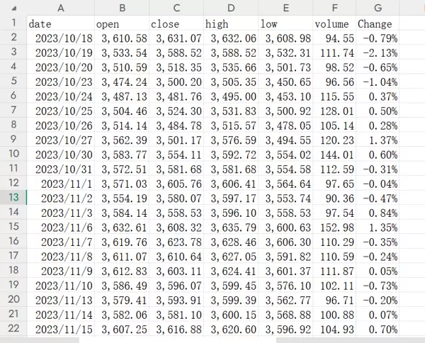 研究所用数据为沪深300指数在2023年10月18日至2025年11月18日期间每日交易信息,包括开盘价、最高价、最低价、成交量和收盘价五个变量。分析过程中主要使用收盘价(close)序列进行后续建模。